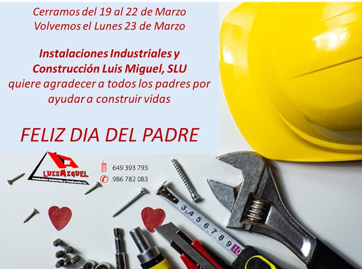 17/04/2020 - COVID19 - RETOMAMOS NUESTRAS ACTIVIDADES. Os informamos de que, a partir del lunes 13 de abril, en INSTALACIONES INDUSTRIALES y CONSTRUCCIÓN LUIS MIGUEL, SL volvemos con nuestro horario habitual al público: de lunes a viernes de 9:00 h. a 13:00 h. y de 15:00 a 19:00 h.